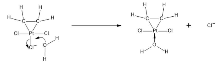 [PtCl4]2- consists of two chlorine atoms and two Cl– ligands bonded to a platinum atom. Due to the large difference in electronegativity between chlorine and platinum, the Pt-Cl bond is very polar, giving the platinum atom a δ+ charge. The double bond in ethene is an area of very high electron density and therefore acts as a nucleophile and is attracted to the δ+ charge on the platinum atom. The double bond in ethene then forms a coordination complex with the platinum atom forcing one of the Pt-Cl– coordination complexes to break, yielding [PtCl3(C2H4)]– and Cl– [scheme 3].